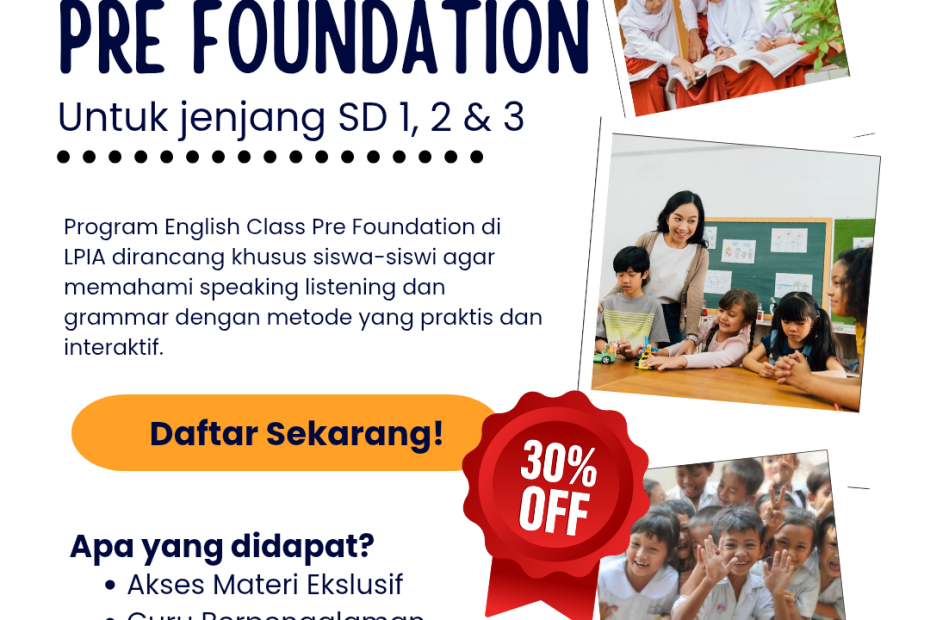 Ortu mana yang gak mau anaknya jago Bahasa Inggris dari kecil? Angkat tangan! 🙋‍♀️🙋‍♂️ Kabar gembira! LPIA Buaran membuka pendaftaran ENGLISH CLASS PRE FOUNDATION khusus untuk jenjang SD kelas 1, 2, & 3! Program ini didesain agar si kecil bisa memahami Bahasa Inggris (terutama speaking & listening) dengan cara yang praktis, fun, dan interaktif! Kami siap bantu wujudkan! 💯 Keuntungan bergabung: 📚 Modul Belajar Lengkap 👩‍🏫 Diajar Guru Berpengalaman 🎁… Read More »Pre Foundation untuk jenjang SD