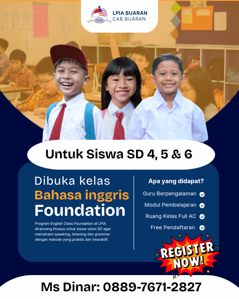 Khusus untuk adik-adik kelas 4, 5, & 6 SD, yuk gabung di kelas English Foundation! Kami fokus melatih Speaking, Listening, dan Grammar dengan metode praktis yang langsung nyangkut di kepala. 🧠💡